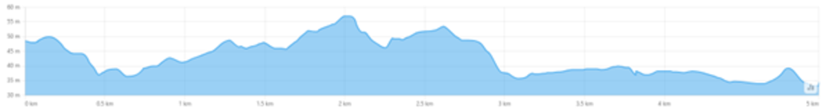 The highest elevation is 57 m above sea level, while the lowest is 25 m at the river confluence. The total ascent is 31 m and the descent is 55 m. The route is not demanding and is suitable for inexperienced cyclists.