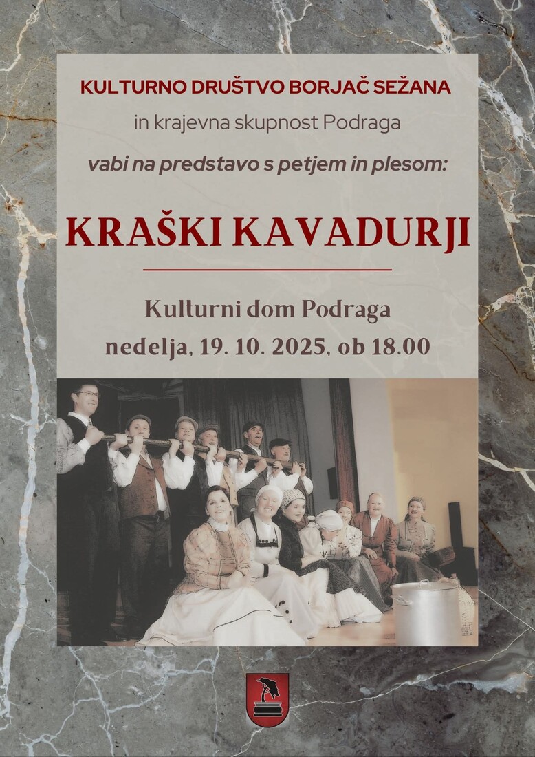 Kulturno društvo Borjač Sežana v sodelovanju s Krajevno skupnostjo Podraga vabi na predstavo s petjem in plesom KRAŠKI KAVADURJI, ki bo v nedeljo, 19. 10. 2025, ob 18.00 v Kulturnem domu Podraga.