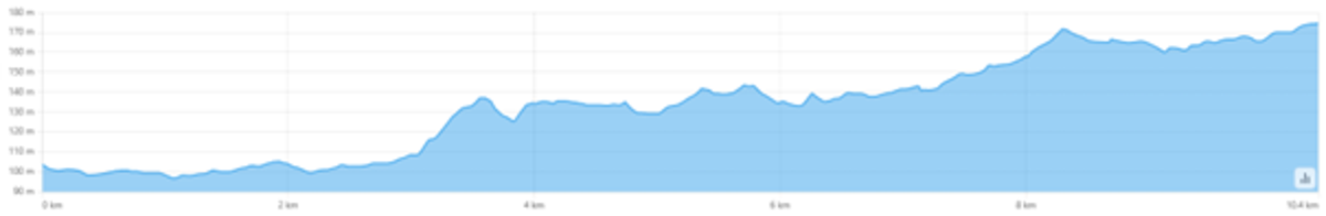 The highest elevation is 57 m above sea level, while the lowest is 25 m at the river confluence. The total ascent is 31 m and the descent is 55 m. The route is not demanding and is suitable for inexperienced cyclists.